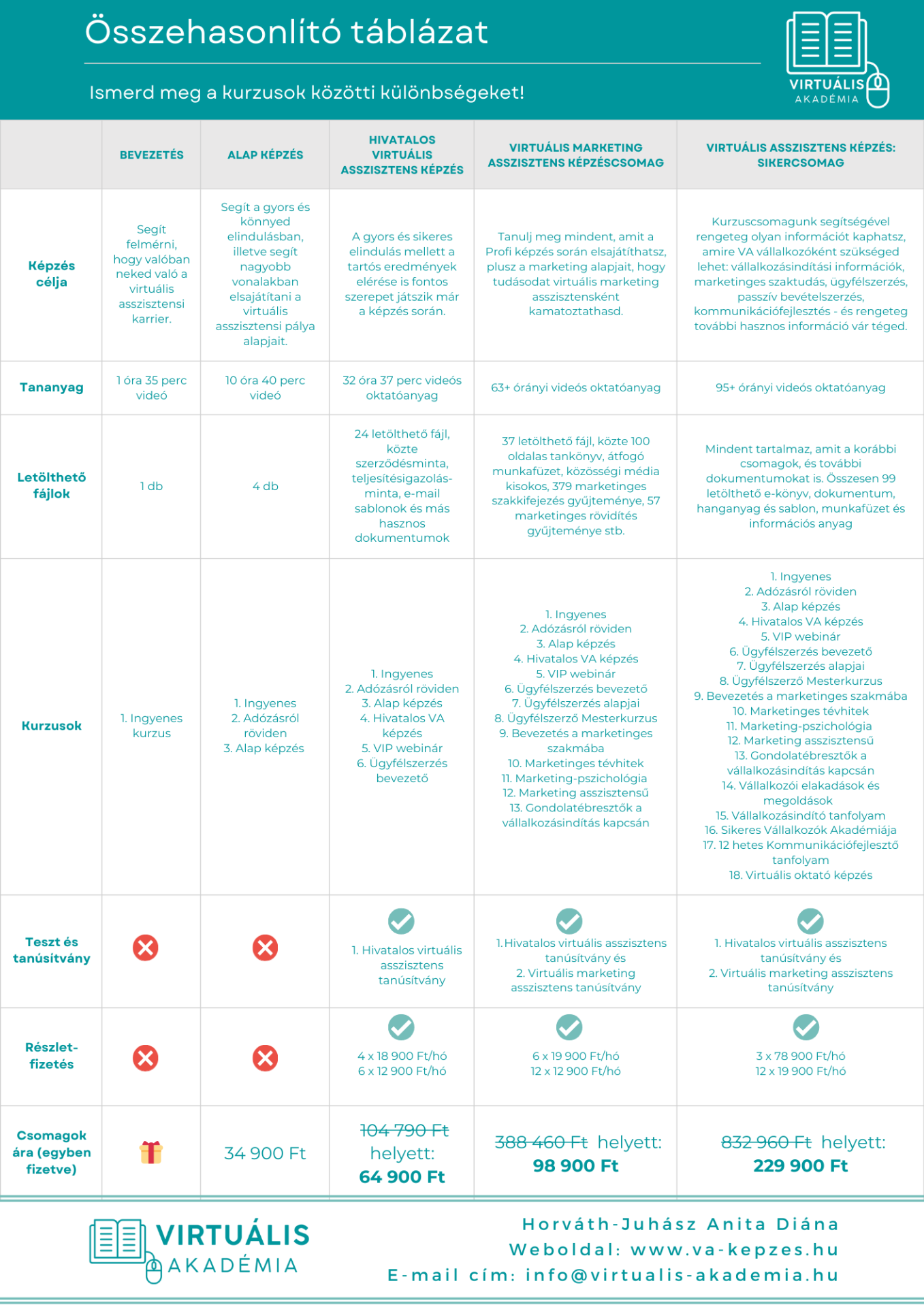 ❌ | ❌ | Hivatalos "virtuális asszisztens" tanúsítványt ad | Hivatalos "virtuális marketing asszisztens" tanúsítványt ad |